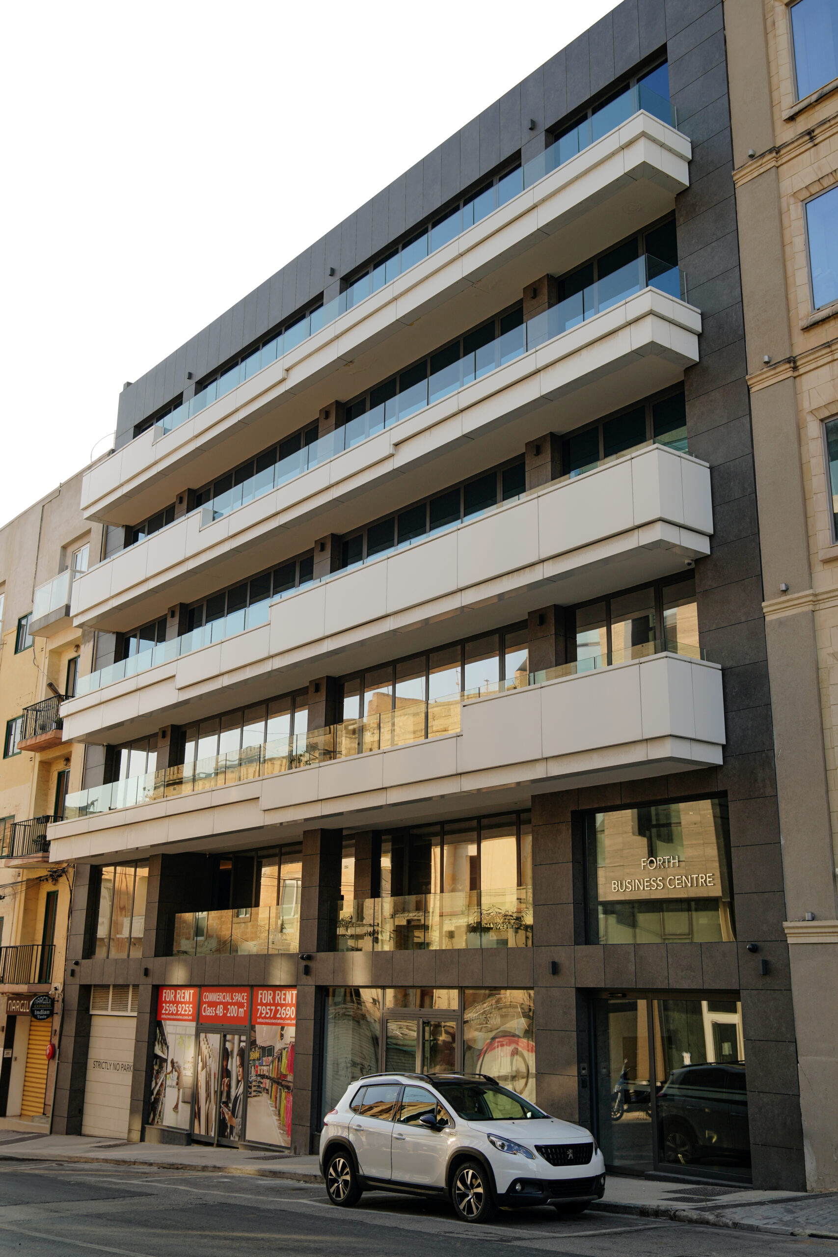 Forth Business Centre is a Commercial Mixed Use Building consisting of two Basement Levels of Parking, Ground Floor Reception and Class 4B Retail, and Class 4A Office from 1st to Receded Floor Level.